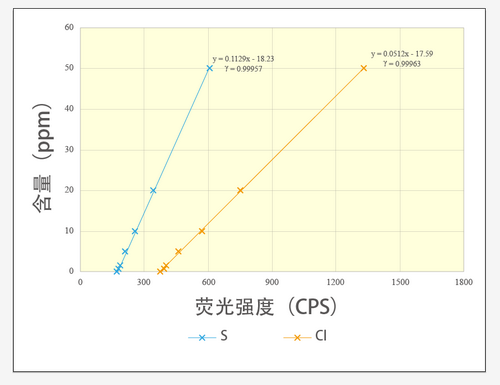 用已知含量的7個(gè)含S、Cl樣品對(duì)儀器進(jìn)行標(biāo)定,得圖7的工作曲線。