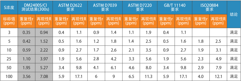 表1. S測(cè)試結(jié)果的重復(fù)性r再現(xiàn)性R與各標(biāo)準(zhǔn)要求的重復(fù)性r再現(xiàn)性R比較