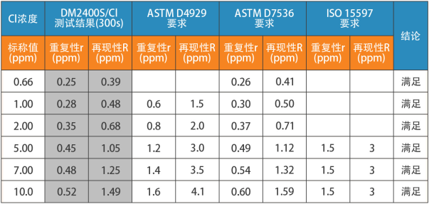 表2. Cl測(cè)試結(jié)果的重復(fù)性r再現(xiàn)性R與各標(biāo)準(zhǔn)要求的重復(fù)性r再現(xiàn)性R比較