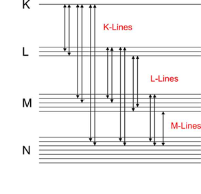 特征X射線光譜依據(jù)躍遷到不同的內(nèi)層軌道K層、L層、M層分別稱為K系、L系、M系特征X射線。特征X射線光譜中,特征線光子的能量等于躍遷的始態(tài)與終態(tài)能級(jí)間的能量差。