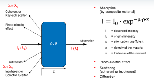 一束X射線通過(guò)物質(zhì)時(shí),就能量轉(zhuǎn)換而言,它的能量分為三部分:散射(改變前進(jìn)方向:相干散射、非相干散射),吸收(產(chǎn)生光電效應(yīng):熒光X射線、俄歇電子)和熱效應(yīng)。